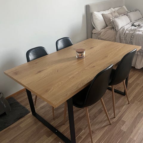 Pöytälevy tammijäljitelmäviilua ja jalat mustaa terästä.