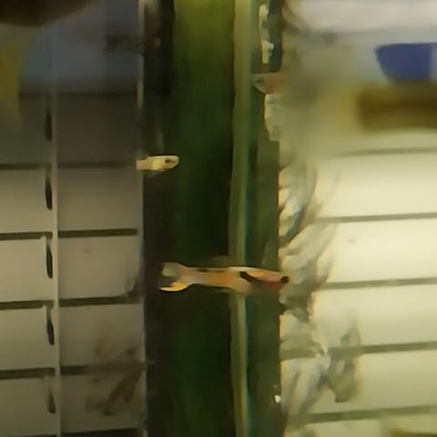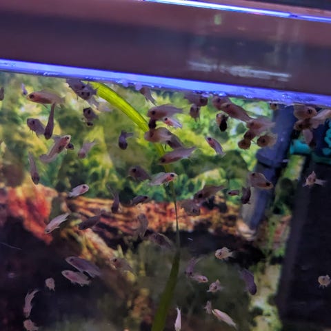 Vilkkaita 1-1,5 cm pituisia hanavedessä huoneenlämmössä kasvaneita miljoonakalan poikasia. Emot aika harmaita, isät värikkäitä. Sukupuolia ei vielä erota. 1e/kpl.