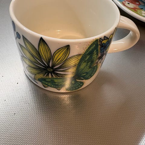 Arabia muki, jossa ruskea lehtikuvio. Valmistettu posliinista. 100-vuotisjuhlavuosi 2017