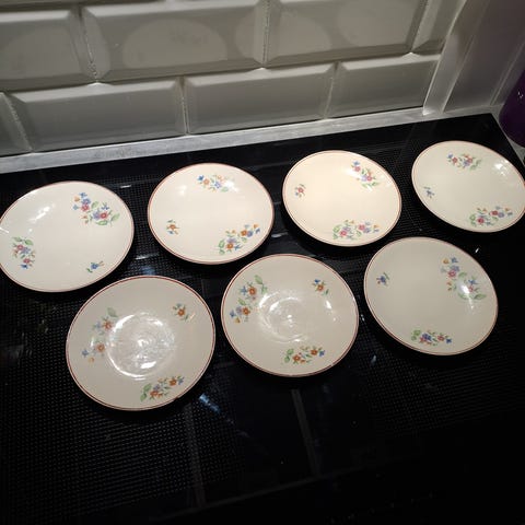 Syviä lautasia on 5, leipä lautasia on 5 ja ruoka lautasia on 6. Osassa lautasissa on säröä reunoissa, muttei ole haitannut käyttöä.