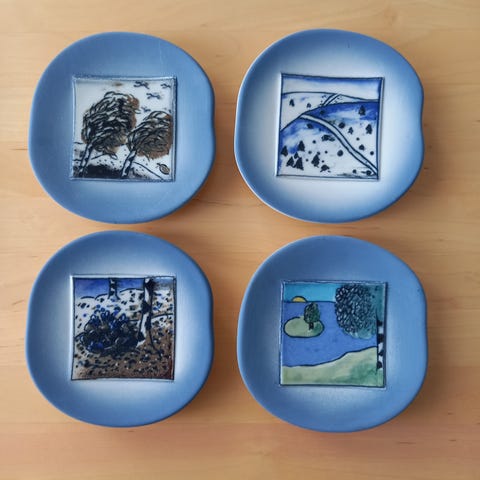Sinivalkoiset Gustavsbergin (Einar Nerman) seinälautaset / vuosilautaset 1980 ja 1982. Ruotsin psoriasisliitto. Halkaisija 21,5 cm. Hyvä käytetty kunto.