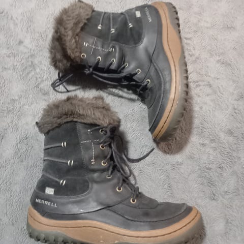 Merrellin lämpimät (400g eristävää lämpökerrosta), vedenpitävät ulkoilujalkineet talvivaellukseen yms. Taipumaton vahva ja tukeva pohja sekä vahvasti tuettu nilkka erinomainen piirre esim. lumikenkäilyä silmällä pitäen. Sisäpohjassa air cushion-vaimennus. Kuin uudet!