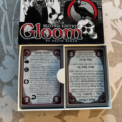 Gloom Second Edition on korttipeli, jossa pelaajat pyrkivät aiheuttamaan hahmoilleen onnettomuuksia ja surullisia tapahtumia. Pelissä on tumman humoristinen teema ja se sisältää erilaisia kortteja, jotka vaikuttavat pelin kulkuun.