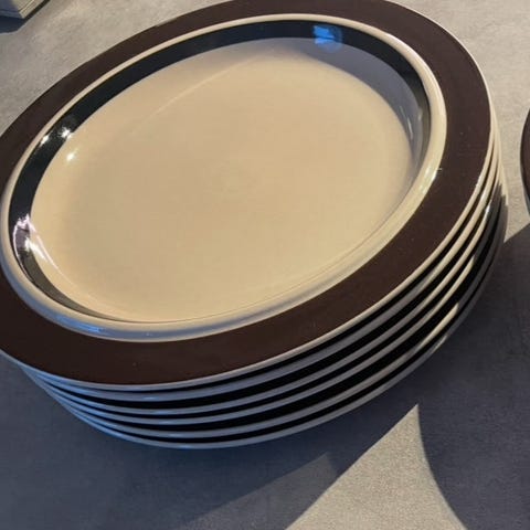Arabia syvät lautaset 6 kpl, joissa on ruskea reunus. Lautaset ovat pyöreitä ja valmistettu keraamisesta materiaalista.