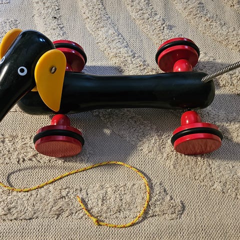 Brion iso musta pyörillä kulkeva mäyräkoira, jota voi taluttaa. Juuri kävelemään oppineelle sopiva! Voi noutaa joustavasti Kannelmäestä.