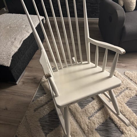 Vähällä käytöllä ollut valkoinen keinutuoli.