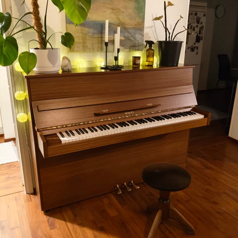 Zimmermann pystypiano ruskealla puupinnalla. Piano sisältää 88 kosketinta ja kaksi poljinta. Sopii erilaisiin soittotiloihin ja harjoitteluun. Ei täysin vireessä mutta ääni on kaunis.