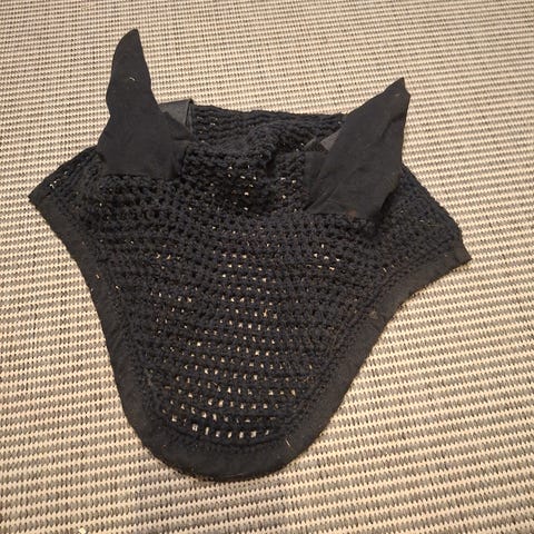 Lähes käyttämätön musta kirvahuppu...pitkä malli, kiinnitettävissä turpahihnaan.
