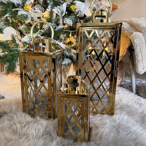 Myydään kolme kullan/messingin väristä lyhtyä. Isoon saa led-kynttilän kaupan päälle.