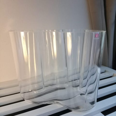 Iittala Alvar Aalto maljakko rusahtavasta lasista. Maljakolla on aaltoileva muotoilu, joka on tunnusomaista Alvar Aallon suunnittelulle.Korkeus 55mm.Nouto Tuusula.Postitus plus kulut.ps.Pohjassa Iittala stanssaus.