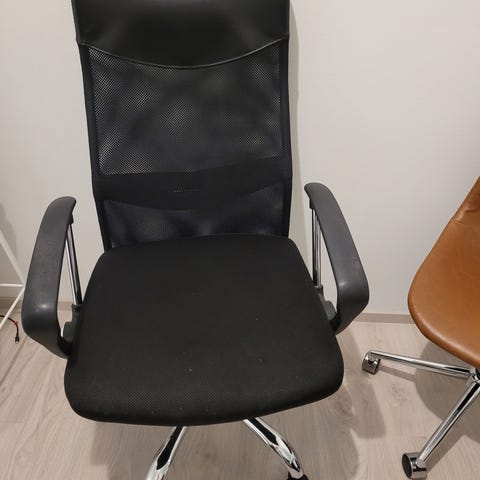 Muutaman vuoden käytössä ollut musta toimistotuoli. Tuolilla on ihan hyvä istua, mutta selkänoja hieman kallistaa taaksepäin sekä natisee. Istuinosassa nukkaa kiinni.