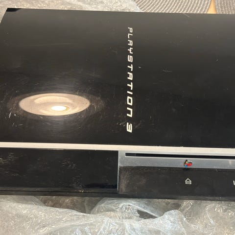 Sony PlayStation 3 pelikonsoli, malli CECHK04. Musta väri, sisältää virtajohdon ja liitännät. Soveltuu PlayStation 3 -pelien pelaamiseen ja mediaesitykseen. versio 4.91. 74 GB.