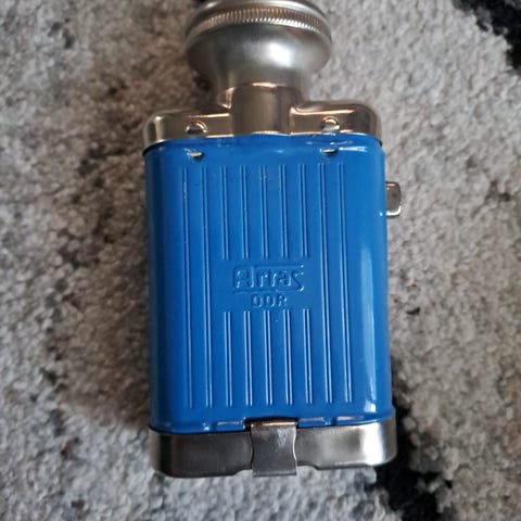 Artas-merkkinen taskulamppu joka valmistettu peltikuoresta ja siinä on sininen, patinoitunut pinta. Toimii litteällä 4,5 voltin 3R12-paristolla, mutta ei ole testattu.