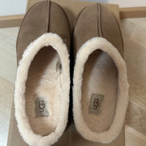 UGG Tohvelit koko 37, vaaleanruskea väri. Toisen tohvelin takaosa hieman lintassa. Ei haittaa juuri käyttöä ja hinnassa huomioitu