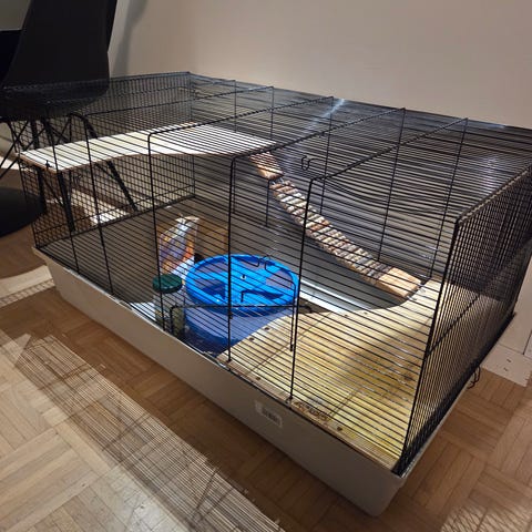 Sisältää häkin, juoksupyörän, liukumäen, piilopaikan, ruokakupin ja muita tarvikkeita, Sekä pussin purua. Hamsterille tai pienelle jyrsijälle.