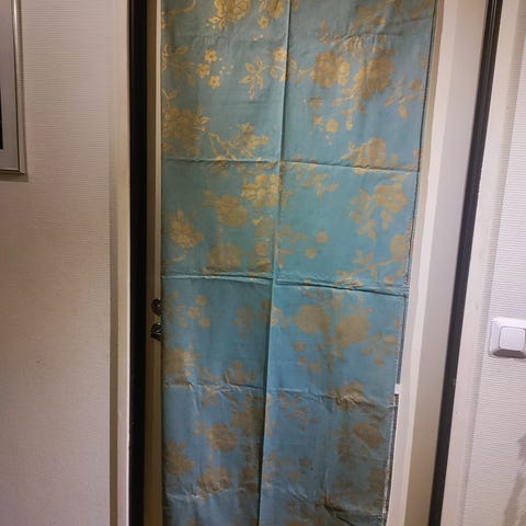 Juhlava valkoinen pöytäliina sinikukilla ja kohokuvioinnilla. Puuvilla viskoosi