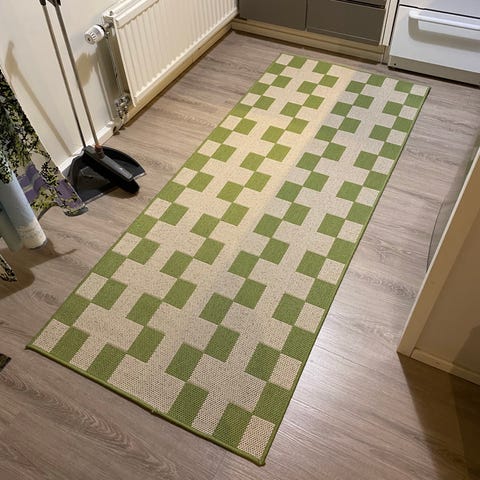 Juuri kaupasta haettu, vain kerran avattu ja testattu matto - todettu liian suureksi omaan keittiöön. Materiaali 100% puuvillaa, konepestävä, sopii esim. keittiömatoksi. Mitat 80x250cm.