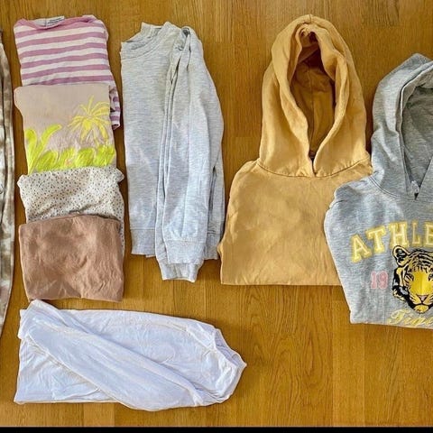 Hyväkuntoisia tytön vaatteita. Huppari, ohuempaa pitkähihaista, t-paitoja, collegehousut, legginsit, pari kertaa käytetyt sukkahousut. Harmaissa sukkahousuissa vähän glitteriä, kuten myös juhlamekossa. Toiset sukkikset vaalean liilat. Hellehatut ja shortsihaalari. Ei lemmikkejä eikä hajusteita. Ehjiä ja puhtaita vaatteita. Osaa vaatteista käytetty enempi, osa lähes käyttämättömiä. Kaikki kerralla yhteishintaan 50e. Kuvassa olevat keltaiset moses sandaalit, koko 34/35 10e.