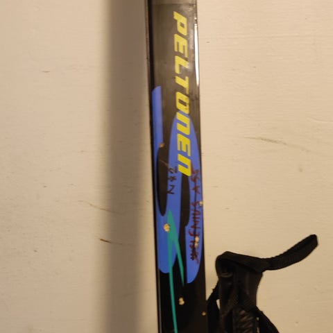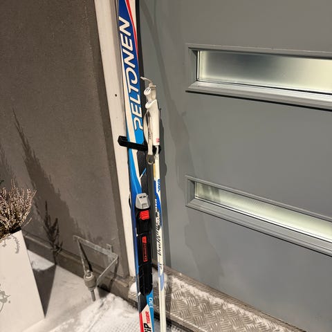 Erittäin hyvät Peltosen 130 cm sukset NNN-siteillä ja Exelin 115 cm sauvat.