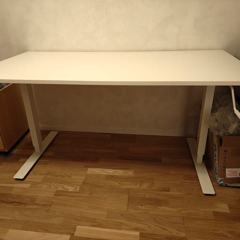 Kolmevuotta vanha, tukeva Ikean Trotten työpöytä. Muutama kuluman jälki toisella sivulla pöytää.