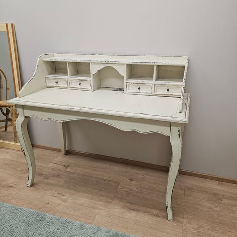 Siisti lasten koulupöytä. Kannessa jälkiä ahkeran koulunkäynnin jäljiltä.