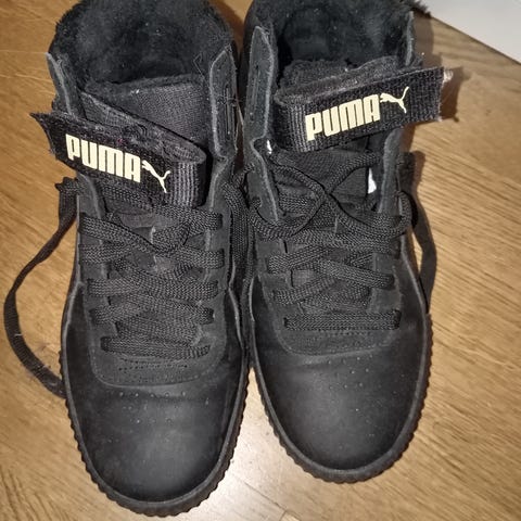 Myydään mustat lasten Puma Rebound JOY Fur - talvilenkkarit koossa 36. sisämitta n. 22,5cm. mukavat, keskikorkeat koripallohenkiset lenkkarit kestävää kumia, joka pitää hyvin. Pehmeä vaimennus. sisäpuolella on tekoturkis, joka pitää jalat lämpiminä kylmillä keleillä. vettähylkivä pinta. syksyllä uutena hankitut, mutta koko jäikin yllättäen pieneksi talvella. Eli käytetty vain lyhyen aikaa. Kunto erittäin hyvä, täysin ehjät ja puhtaat. Ainoastaan pientä nyppyä sisäpuolella. ei nimikoitu.