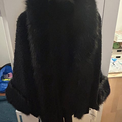 Liila pehmeä viitta. Noin 150cm pitkä. Hupulla ja naruilla.