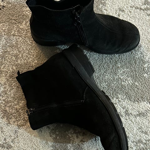 Mustaa nupukkinahkaa, karvaa kenkien suissa. Nouto Jätkäsaaresta.