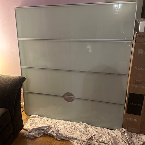 Lasinen seinä tai sermi. Leveys 120cm, korkeus 130cm, paksuus 6cm, voit koota myös kerroksittain. Sopii esimerkiksi television taustalasiksi, tilanjakajaksi jne. Koostuu neljästä päällekkäin kiinnitetyistä elementeistä joten voidaan koota mieleiseen kokoon vierekkäin tai päällekkäin. Kuvassa kaksi koottua seinämää. Hinta yhdeltä seinämältä 60e.
