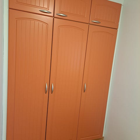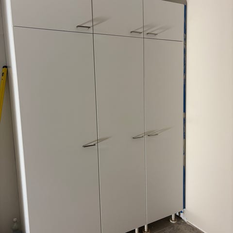 Annetaan varastoon vuosikausiksi unohtunut vaatekaappi. Kaappi on varastossa osina. Kuvissa on koottuna toinen kaappi, mutta aivan saman näköinen ulkoa päin kuin varastossa osina oleva kaappi. Kaapissa on liukuovet, joissa on peilit. Varasto sijaitsee Jyväskylän Lohikoskella.