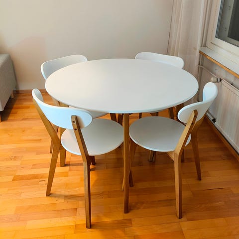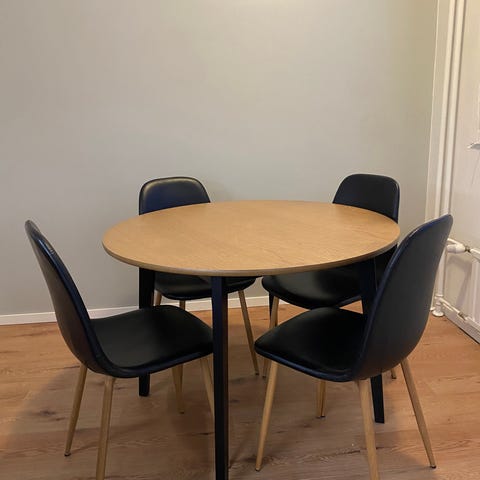 Myynnissä settinä Jyskin ruokailuryhmä ”Ringsted + Klarup”. Settiin kuuluu ruokapöytä Ø 100 cm ja 4 kpl mustia tuoleja. Omaan silmään en huomaa pöydässä enkä tuoleissa mitään kolhuja tai muita käytön jälkiä, tämä setti ostettu noin vuosi sitten eli on todella hyväkuntoinen. Setin ovh. 240€. Nouto Linnainmaalta, ei kulkeudu mihinkään!