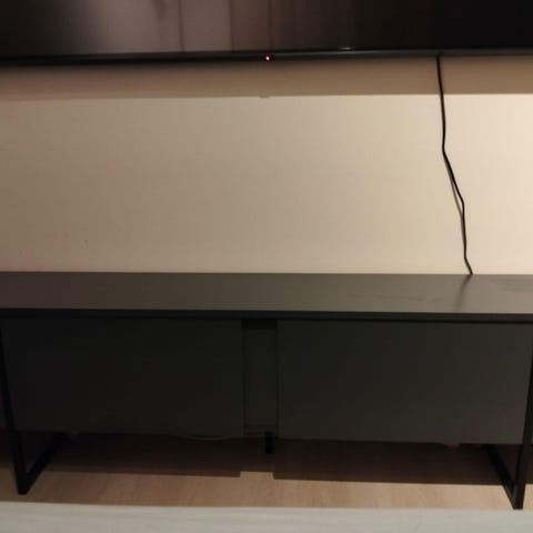 Verkkokaupasta ostettu musta tv-jalusta/teline myyntiin.