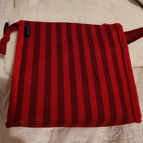 Myydään Marimekon meikkilaukku, halkaisija 18cm, korkeus 10cm. Siisti ja hyvä kunto. Sisäpinnoilla meikkitahraa.
