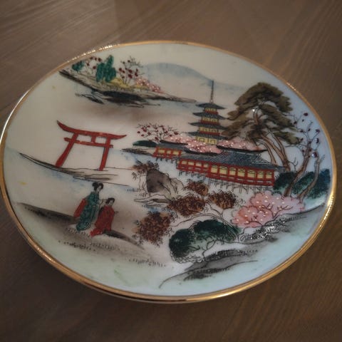 Kolme pientä japanilaista kuppia ja pullo, pullon korkeus 12 cm. Hinta koko setille.