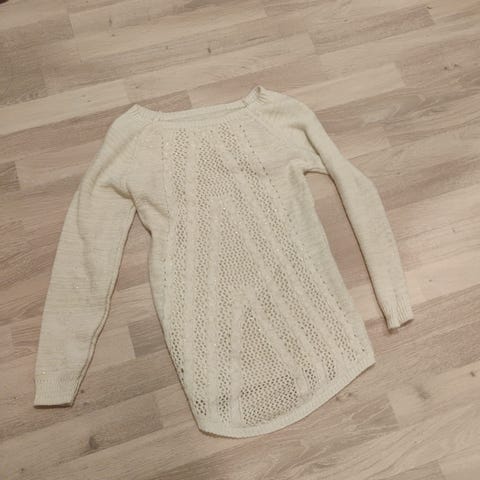 Sinivioletin värinen lyhyen mallinen neule.jossa kimalletta