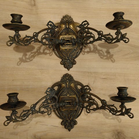 Tyylikkäät antiikkityyliset seinävalaisimet (2 kpl). Kaunis patinoitu metalli, klassinen muotoilu – tuo arvokkuutta ja tunnelmaa sisustukseen. Sopii erinomaisesti olohuoneeseen, eteiseen tai työhuoneeseen.