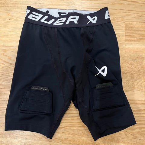 Bauer Compression Fit alasuojashortsit mustassa värissä. Koko Youth L. Menee hyvin 140-160 cm pelurille. Valmistettu joustavasta materiaalista, tarkoitettu käytettäväksi jääkiekossa. Nouto Turusta.