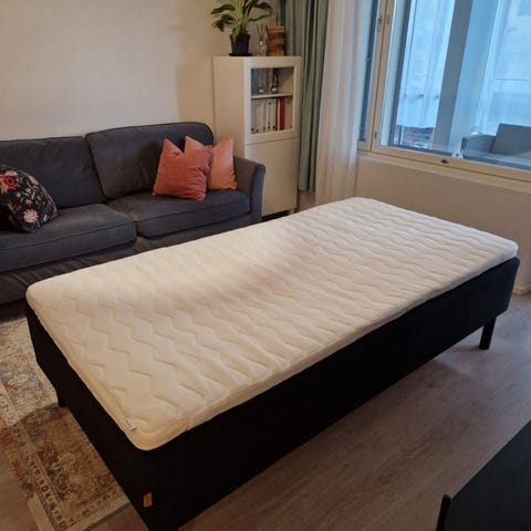 Erittäin hyväkuntoinen laadukas DUX-runkopatjasänky painoltaan kevyeltä nukkujalta nyt ylimääräisenä uusille höyhensaarille. Ollut suojattuna muotoonommellulla reunalakanalla ja paksulla petauspatjalla eli erittäin siistikuntoinen ja ehjä. Sänky Helsingin Munkkiniemessä.