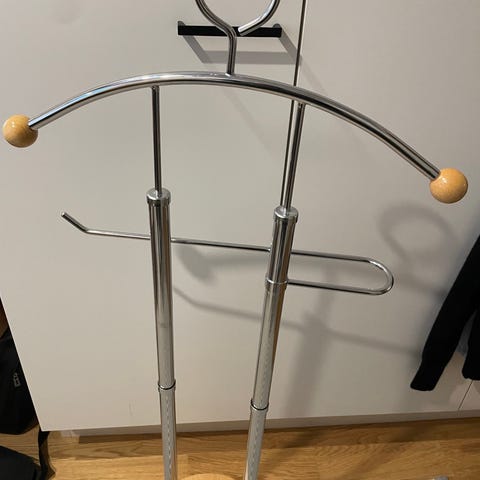 Vuosia eteisessä käytössä ollut vaatesäilytysratkaisu. Tanko, koukkuja, hattuhylly ja lokero kengille. Ehjä, mutta toki jotain peruskulumaa käytöstä. Koirakoti. Nostettu nyt lämpimään autotalliin odottamaan hakijaa.