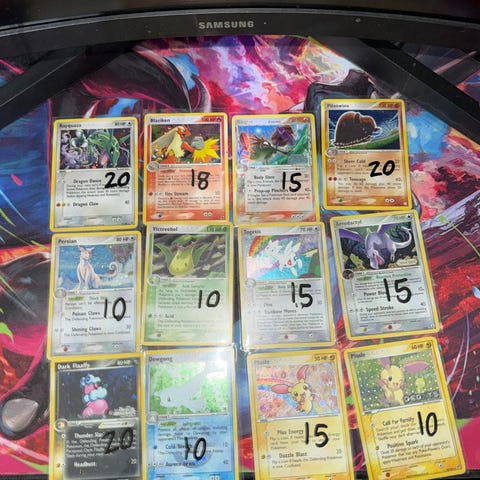 Myynnissä 13kpl erilaista vintage holo energy Pokemon korttia. Sarjoista EX Emerald, EX Holon Phantoms, EX Power Keepers ja 2006 League Promo.