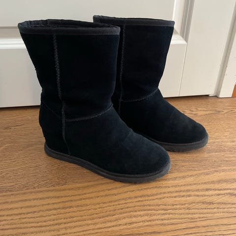 UGG korkokengät, koko 40, musta väri. Kengissä on avonainen varvasosa ja nilkan ympärille sidottavat nauhat. Korko on kiilamallinen ja päällystetty juuttimaisella materiaalilla.