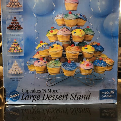 Myyntiin lähes käyttämätön cupcake-/muffinssiteline, kaunis ja käytännöllinen juhlapöytään, korkeus noin 23cm.
