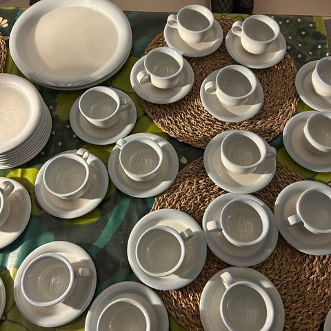 Pentik Menu kahvi / teekalusto, vaaleanharmaa / vaaleansinertävä, keramiikkaa. Sisältää kannun, 6 kuppia ja tassit, kermakon ja sokerikon.