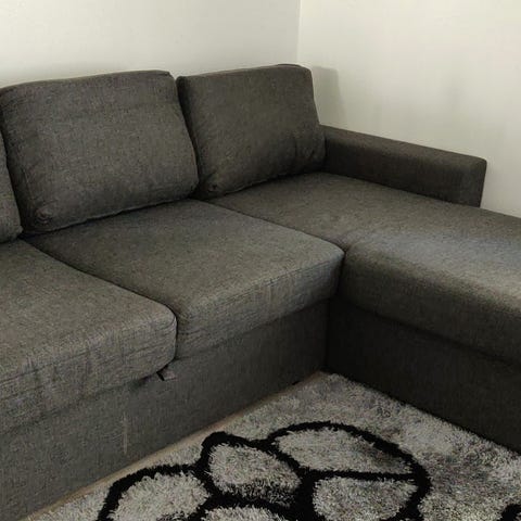 Sotka sohva harmaalla Interno kankaalla. Sohva on suunniteltu istumiseen ja lepoon, ja se voidaan muuttaa vuoteeksi.
