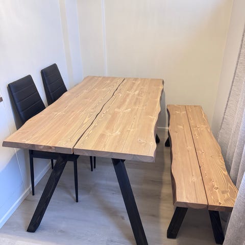 Myydään liian pieneksi jäänyt saarnesta tehty lankkupöytä, samaan sarjaan kuuluva lankkupenkki ja 2kpl valkoisia tuoleja. Jalat täyttä rautaa. Pöytä erittäin painava, mutta helppo laittaa osiin ja näin siirtää. Pöydän ja penkin jalkojen alla pehmusteet tarralla.