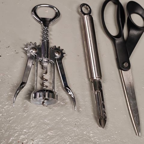 Kaikki kuvassa näkyvät keittiövälineet. Sisältää fiskars kastikekauhan, keep cup mukin, viinipullon avaajan, vispilän ja neljä pientä purkkia. Olleet muutamia kertoja käytössä.