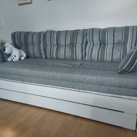 Levitettävä, 3 istuttava vuodesohva, jossa myös säilytystilaa vuodevaatteille.