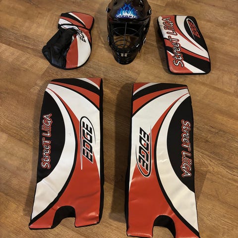 Lasten Street Hockey maalivahdin suojat, jotka sopivat hyvin myös pihapeleihin / jääkiekkoon. Mukana maalivahdin patjat (noin 58cm), räpylä ja kilpi.