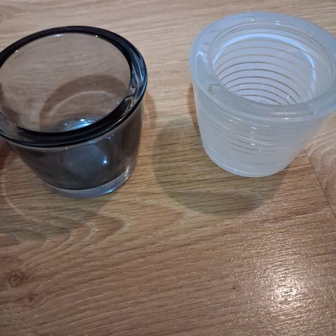 4 tuikkukippoa, 2 matalaa (ehkä 5cm) ja 2 korkeampaa (ehkä 15cm), alaosa betoninvärinen, yläosa puunvärinen, tuikun alusta ehkä kuparia. Kevyet, ei tietoa materiaalista.