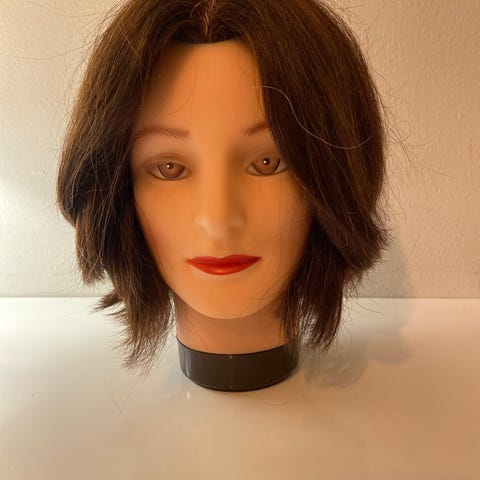 Harjoituspää pitkillä ruskeilla hiuksilla